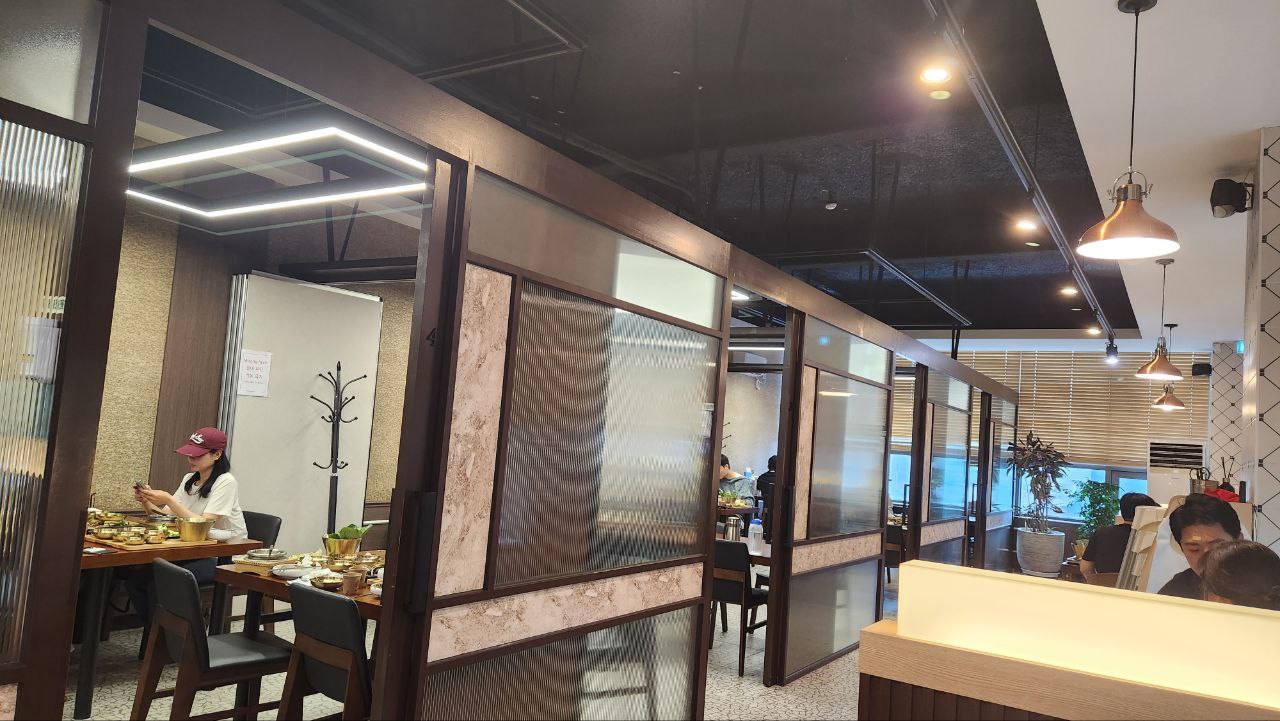 사진에서 보시다시피 각 테이블은 반독립된 룸 형태로 구성되어 있어 조용하고 편안한 분위기에서 식사를 즐길 수 있습니다. 가족 단위, 회식 모임, 데이트 장소로도 최적화되어 있어 다양한 고객층에게 인기가 높습니다.
