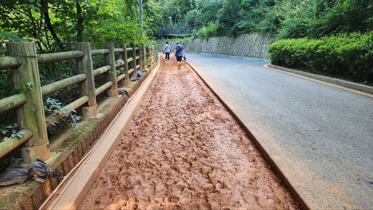 코스 중간에는 발을 맨 상태로 걸을 수 있는 맨발 황토길이 있어 인기입니다. 황토의 자연 지압 효과로 혈액순환을 도와주고, 건강을 챙기며 산책을 즐길 수 있습니다. 아침 시간에는 많은 어르신들이 이곳을 찾는 모습을 볼 수 있습니다.