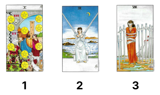 한 상담 사례에서는 컵 6 + 동전 10 + 검 2 조합이 나왔습니다. 해석은 다음과 같았습니다.