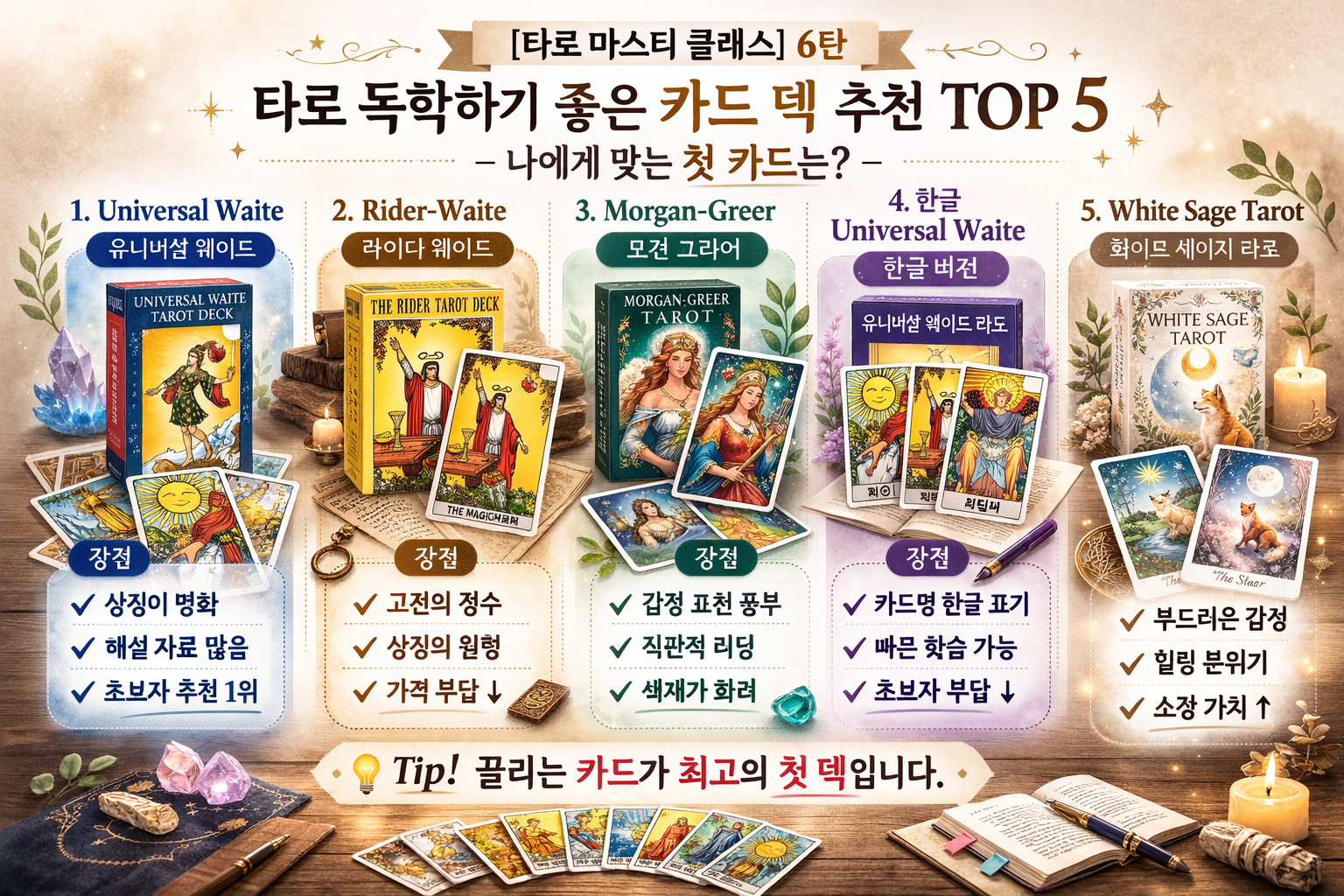 하지만 입문 단계에서는 “예쁜 카드”보다 먼저 배우기 쉬운 카드인지, 해설 자료가 충분한지, 상징이 명확한지를 보는 것이 중요합니다. 첫 덱은 단순한 소장품이 아니라, 앞으로 타로의 기초를 익히게 해 줄 가장 중요한 교재이기 때문입니다.