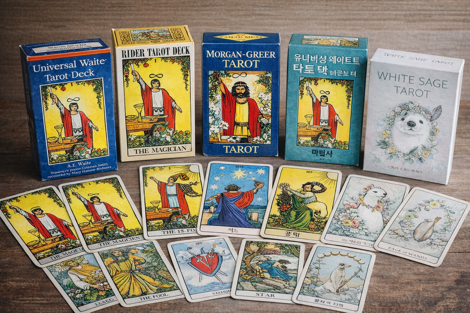 시중에는 정말 다양한 타로 덱이 있습니다. 전통적인 그림체를 가진 카드도 있고, 동물이나 판타지 콘셉트로 재해석된 카드도 있으며, 한글 버전과 미니 사이즈 덱까지 선택지가 넓습니다. 처음 시작하는 입장에서는 오히려 선택지가 많아서 더 어려울 수 있습니다.