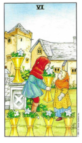 컵 6번 카드는 과거의 추억, 익숙함, 정서적 안정감, 그리고 이미 연결된 인연을 의미합니다.