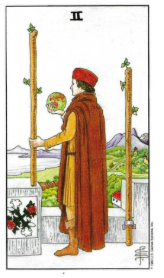 완즈 2번 카드는 선택 고민, 방향 결정, 관계의 가능성 탐색을 의미합니다.
